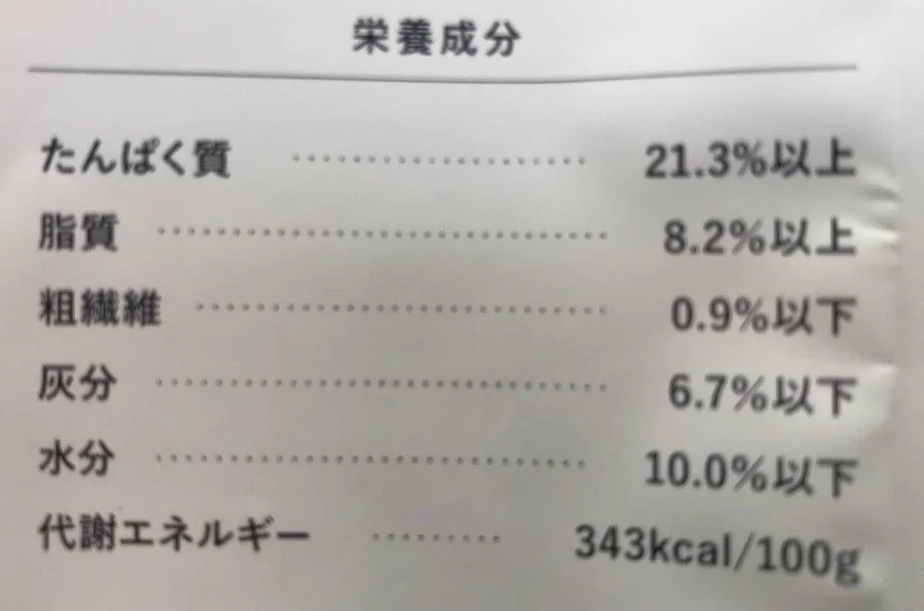 成分 | タンパク質21.3%以上、脂質8.2%以上、粗繊維0.9%以下、灰分6.7%以下、水分10%以下 |