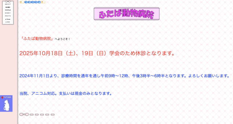 診療対象犬、猫、牛、ウサギ、ハムスター、チンチラ、モルモット、ハリネズミ